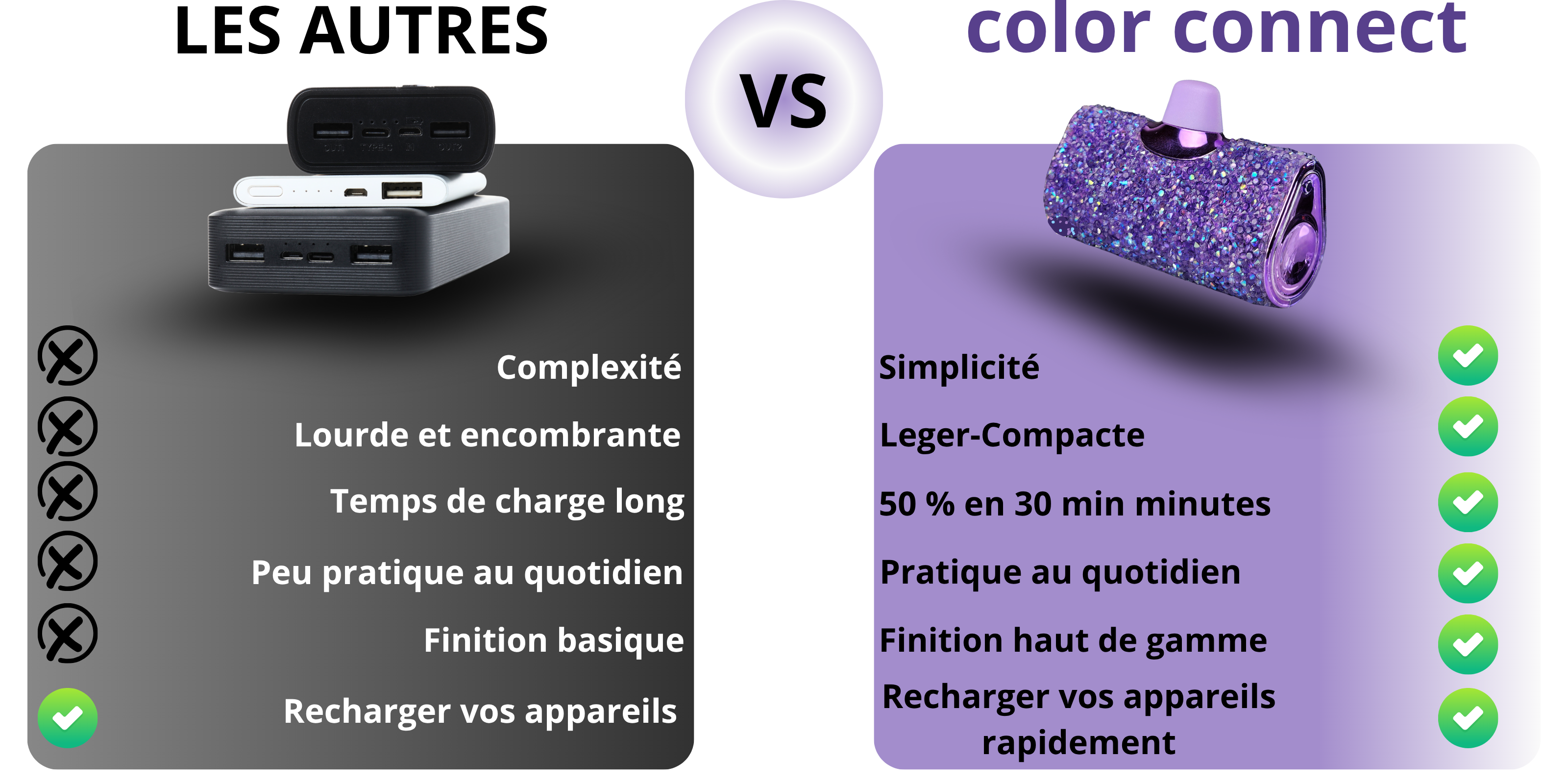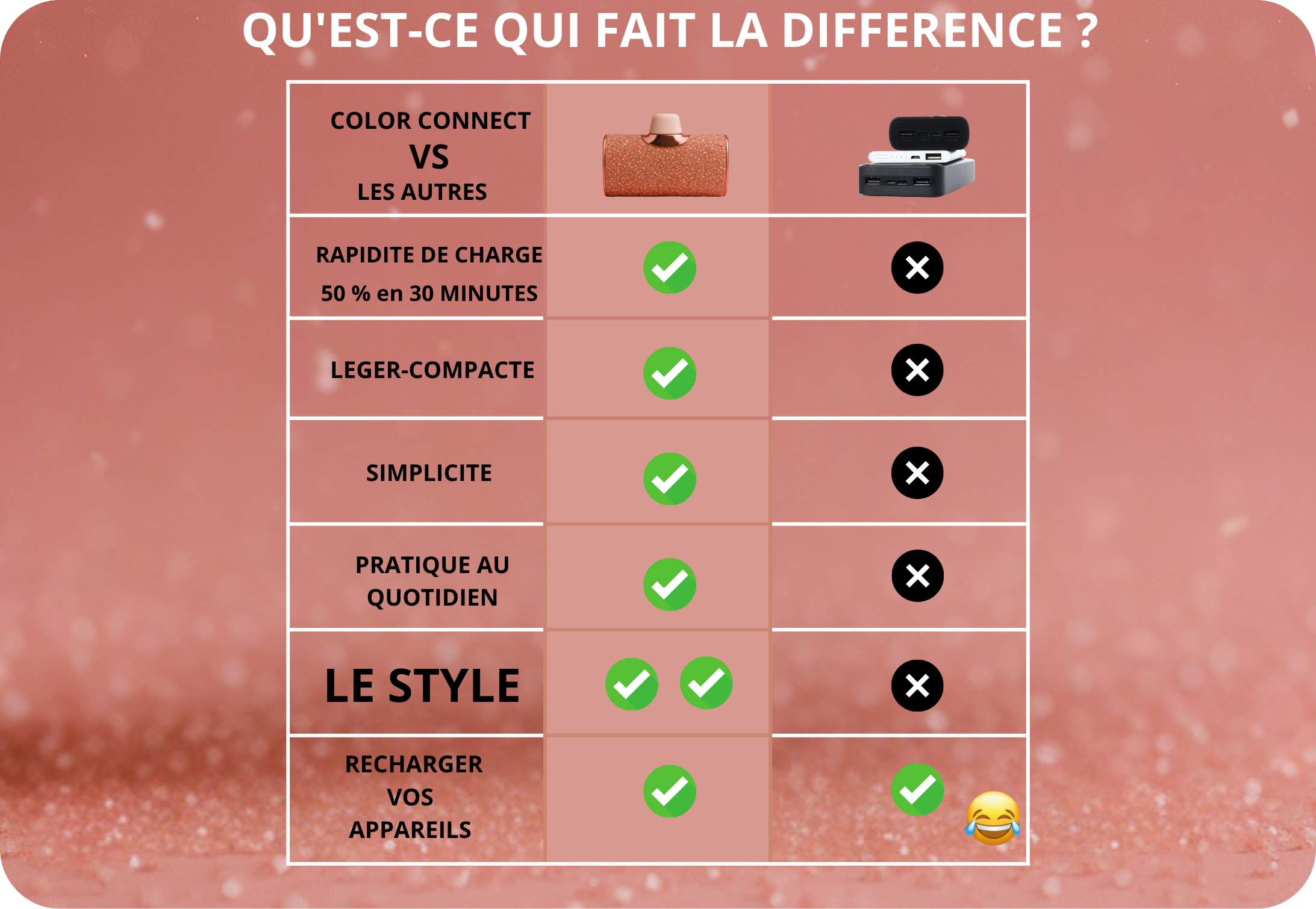 Notre mini batterie dispose d'une capacité de 5000 mAh,ce qui permet de recharger un smartphone une à deux fois selon le modèle (iphone,Samsung,etc.).Compacte mais puissante,elle est parfaite pour rester connectée toute la journée sans prise de tête. Recharger votre smartphone jusqu'a 50 % en seulement 30 minutes.